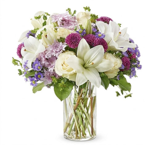 Our always popular Birthday Cheer Bouquet is set to celebrate with its bright, beautiful blooms wishing your special recipient every happiness on their big day! Coral roses, yellow spray roses, hot pink gerbera daisies, white traditional daisies, solidago and lush greens are perfectly arranged in a classic clear glass vase tied with pink satin and green chenille ribbons. Arriving with a Happy Birthday mylar balloon, this bouquet will add to the warmth and happiness of their birthday festivities.
